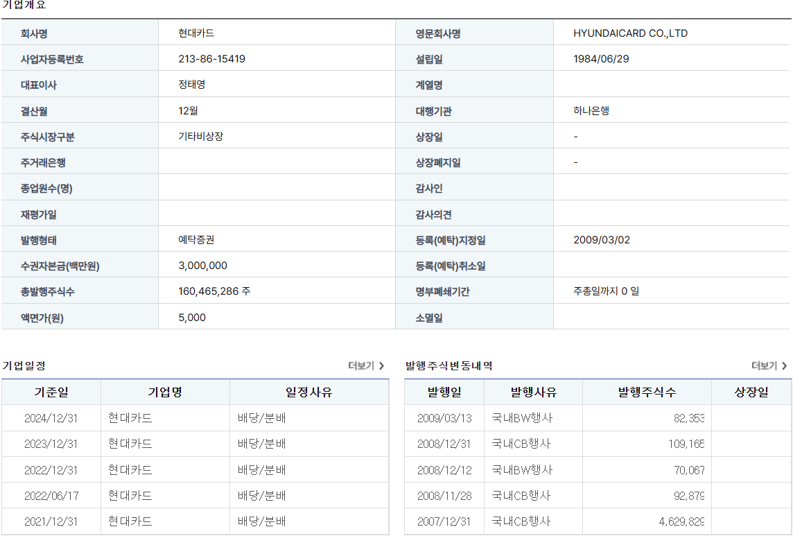 현대카드는 정태영 부회장이 2003년 대표이사로 취임 후 2025년 1분기 기준 19.2% 국내 3위까지 올라섰으며, 2023년 3월 애플페이 도입, 해외 신용판매취급액 1위를 기록했습니다. 현대카드는 지분 구성은 현대자동차 36.96%, 기아 6.48%, 현대커머셜 34.62%, 대만 푸본금융이 19.98%를 보유하고 있으며, 현대커머셜은 현대자동차 37.5%, 정명이 대표와 정태영 부회장이 37.5%를 보유하고 있습니다. 2021년 현대카드는 상장을 추진할 것으로 예상했으나, 현대커머셜 및 대만 푸본그룹이 기존 재무적 투자자 지분을 인수하면서 상장을 미뤄졌으며, 현대차그룹이 현대피탈은 보유하고, 현대커머셜과 현대카드를 계열분리를 진행하고 있는 것으로 알려져 있습니다. 현대카드는 상장 여부는 좀 더 지켜봐야 할 것으로 보이며, 계열 분리 후 상장을 추진할 것으로 예상하고 있습니다.