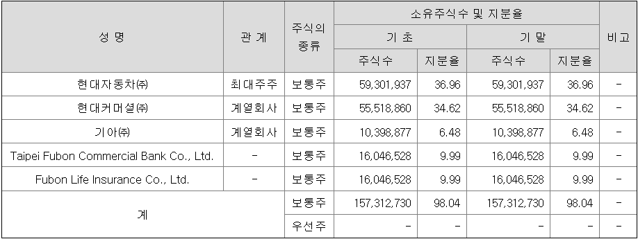 현대카드 주식은 액면가 5,000원에 총발행주식수는 160,465,286주이며, 주요 주주로는 현대자동차 36.96%, 현대커머셜 34.62%, 기아 6.48%, Fubon 19.98%, 기타 및 소액주주로 구성되어 있습니다.
