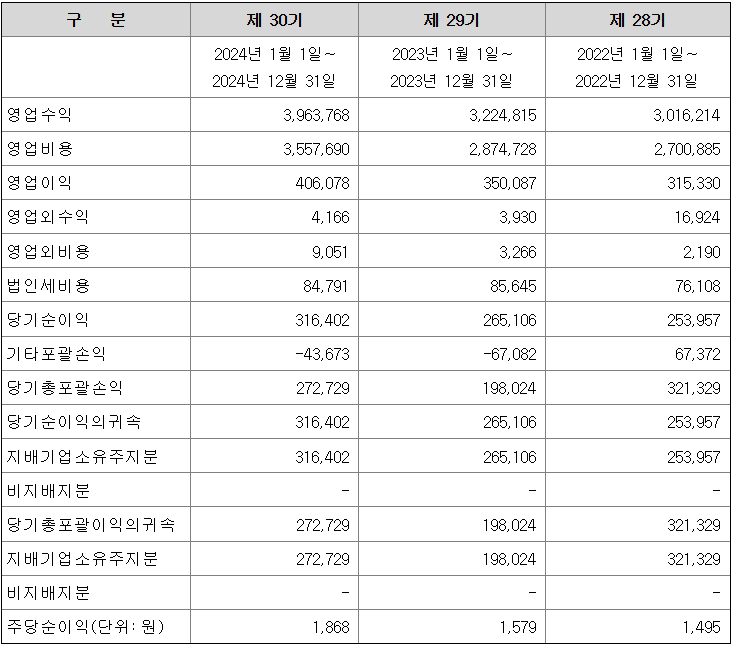 현대카드와 종속기업 영업수익은 2020년 2조 5,261억 원, 2021년 2조 7,449억 원, 2022년 3조 162억 원, 2023년 3조 2,248억 원을 기록했으며, 2024년 영업수익 3조 9,637억 원, 영업이익 4,061억 원, 순이익 2,727억 원을 기록했습니다.