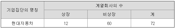 현대자동차그룹은 계열사로 상장 12개사, 비상장 60개사를 두고 있습니다.