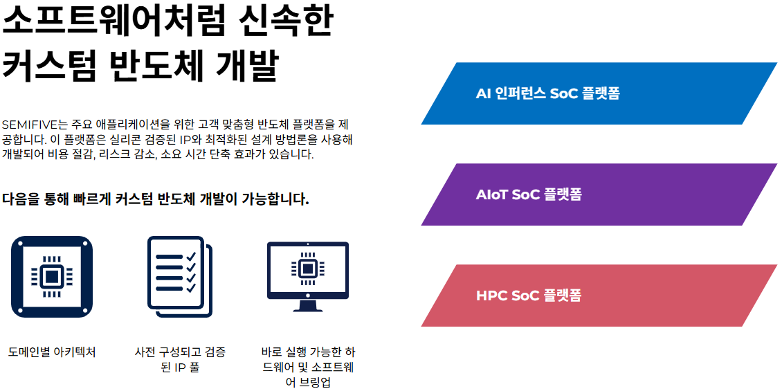 1. 기업 개요세미파이브(SEMIFIVE)는 2019년 5월에 설립되었으며, 주요 사업으로는 비메모리용 및 기타 전자집접회로 등을 개발, 제조하고 있습니다. 세미파이브 주식은 액면가 1000원에 총발행주식수는 28,268,800주이며, 주요 주주로는 SiFive 17.69%, 대표이사 조명현 2.40%, 한국산업은행 11.81%, 펀드, 사모투자, 기타 및 소액주주로 구성되어 있습니다. 세미파이브 종속기업으로는 아날로그 비츠, 세미파이브 미국, 인도, 베트남 법인을 두고 있습니다. 2. 주요 사업세미파이브는 반도체 SoC(시스템 온 칩) 플랫폼, ASIC(맞춤형 반도체) 설계 등 반도체 팹리스 최적화 / 반도체 디자인 IP(설계자산) 재사용, 반도체 자동화 솔루션 등을 통해 반도체 설계기간 및 비용 최..
